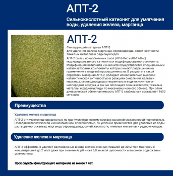 АПТ-2 является ионнообменным и каталитическим материалом для обезжелезивания, удаления марганца и умягчения воды.