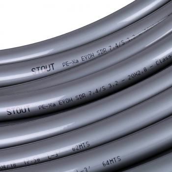 Труба серого цвета STOUT PE-Xa/EVOH из сшитого полиэтилена применима для внутренних сетей холодного, горячего водоснабжения, а также для радиаторного отопления и системы "теплый пол".